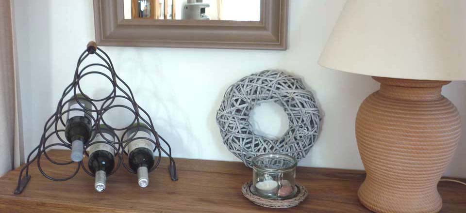Im Wohnraum selbst zaubert eine geschmackvolle Einrichtung aus massiven Teakmöbeln eine ruhige Atmosphäre. Neben einem schweren Teakholz Tisch für acht Personen und einer Anrichte im östlichen Teil des Gebäudes befindet sich am westlichen Ende des Raumes eine gemütliche Polstersitzgruppe mit zwei Recamieren zum Entspannen vor dem Kaminfeuer. Im Bücherschrank finden sie Literatur, Gesellschaftsspiele, Kinofilme und Tonträger.