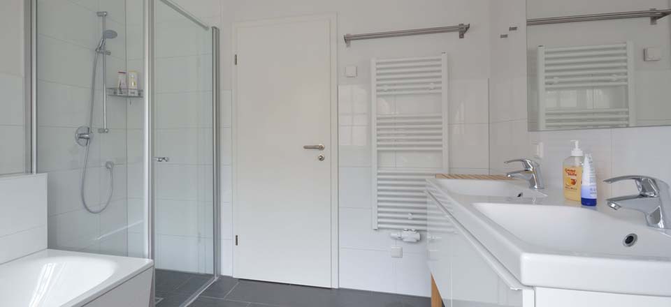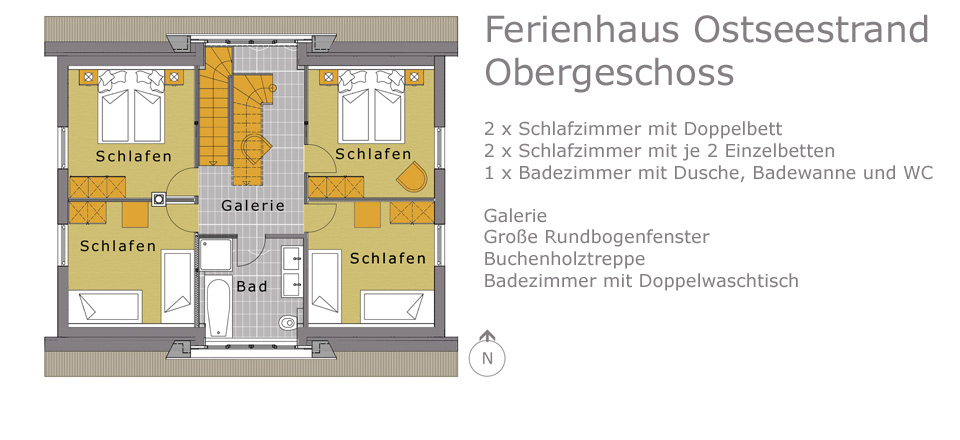 Über eine Buchenholztreppe gelangt man zur Empore ins Obergeschoss. Von der Diele mit Rundbogenfenster und Leseplatz gelangen Sie in das Badezimmer mit Doppelwaschtisch, bodengleicher Dusche und Badewanne sowie in zwei Schlafräume mit Doppelbetten und zwei weitere mit Einzelbetten versehene Schlafzimmer. Alle Betten sind mit an Kopf- und Fußteil, sowie in der Härte verstellbaren Federholzrahmen ausgestattet. Die Markenmatratzen sind mittelhart, mit Prüfsiegel und haben eine Sommer- und Winterseite.